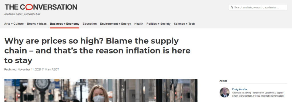 Austin, Craig (2021), Why are prices so high? Blame the supply chain – and that’s the reason inflation is here to stay, The Conversation, https://theconversation.com/why-are-prices-so-high-blame-the-supply-chain-and-thats-the-reason-inflation-is-here-to-stay-169441