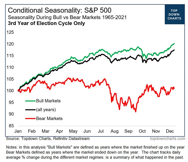 Callum Thomas provides an interesting chart in his weekly char pack about seasonality for S&P 500 in the 3rd year of an election cycle. According to his charts, the market is generally positive for the first half of the year. For the second half, the market remains around a certain level for until a further upward in December in bull markets, while the market keeps dropping until some rallies closing to year end in bear markets.