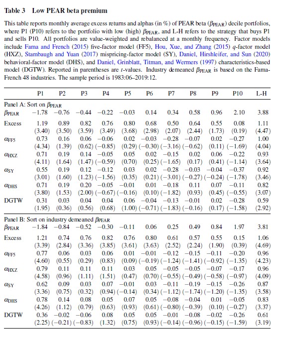 They formed 10 decile group value-weighted portfolios based on the size of PEAR betas in the prior month. The PEAR beta spread portfolio (Low Minus High) is a paper strategy buys stocks in smallest PEAR betas group and sells stocks in largest group. Rebalancing monthly, the average monthly excess return for the spread portfolio is 1.11%. Even tested with five-factor model, q-factor model, mispricing-factor model, behavioural factor model and DGTW characteristic model, at least 50% of the average monthly excess return of the PEAR beta spread portfolio is not explained. After tested again with industry demeaned PEAR betas, the low PEAR beta premium is not likely an industry-level phenomenon.