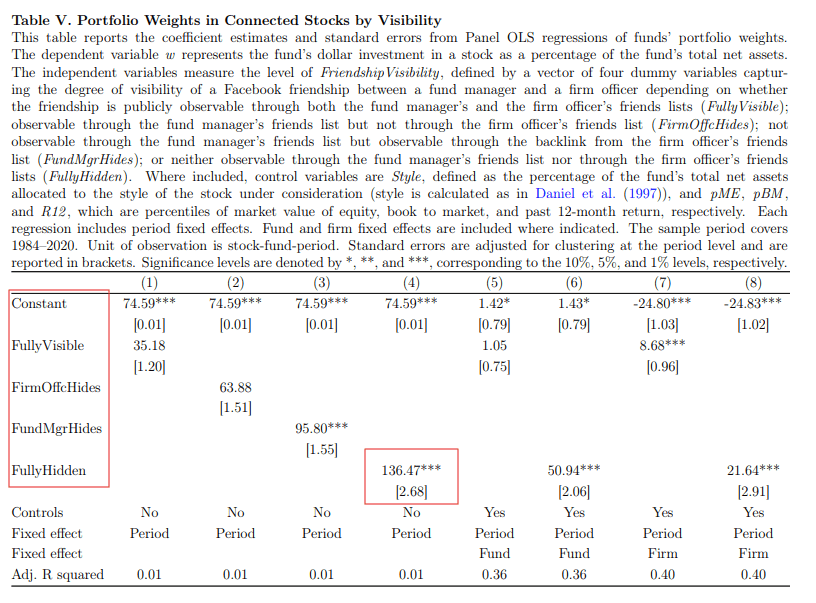 From a portfolio weight perspective, fund managers on average invests more in the firms which their friends are officers. Especially when both fund managers and firm officers fully hide their friend list, these fund managers tend to invest 136.5 bps in their friend’s company.