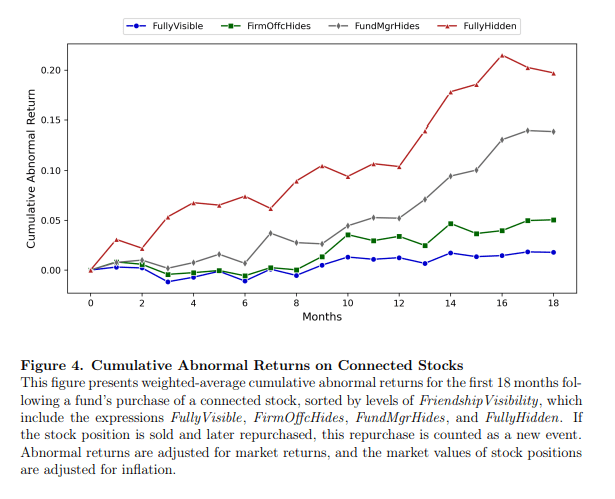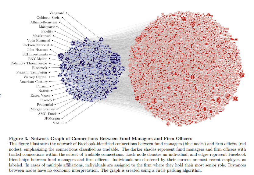 The working paper of Amman, Cochardt, Cohen and Heller (2024) is trying to understanding the performance impact of non-public personal relationship between fund managers and company officers. They utilize data on Facebook to construct their dataset of fund manager and firm officer connection. They document significant abnormal returns in domestic and actively managed US equity funds performance from the hidden connections between fund managers and company officers.